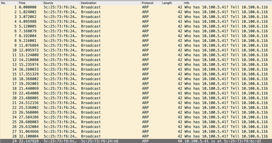 To confirm whether ARP suppression was causing the issue, we captured ARP traffic on both the source server and the related interface VLAN (SVI) on the local leaf switch simultaneously. Our expectation was that every ARP reply leaving the server would also be visible on the switch’s SVI.